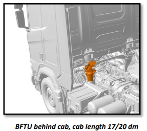 The installation location of BFTU depends on the cab length: for cab lengths of 17 dm and 20 dm, the BFTU is mounted behind the cab on the cab bracket while for cab lengths of 28 dm and 31 dm, it is mounted on the chassis frame.