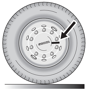 Scania recommande de tracer une ligne au-dessus des goujons de roue et des écrous de roue pour déceler plus facilement les écarts éventuels. Utiliser un marqueur. Si un écrou de roue dévie, retirer complètement l'écrou de roue et le remettre en place.